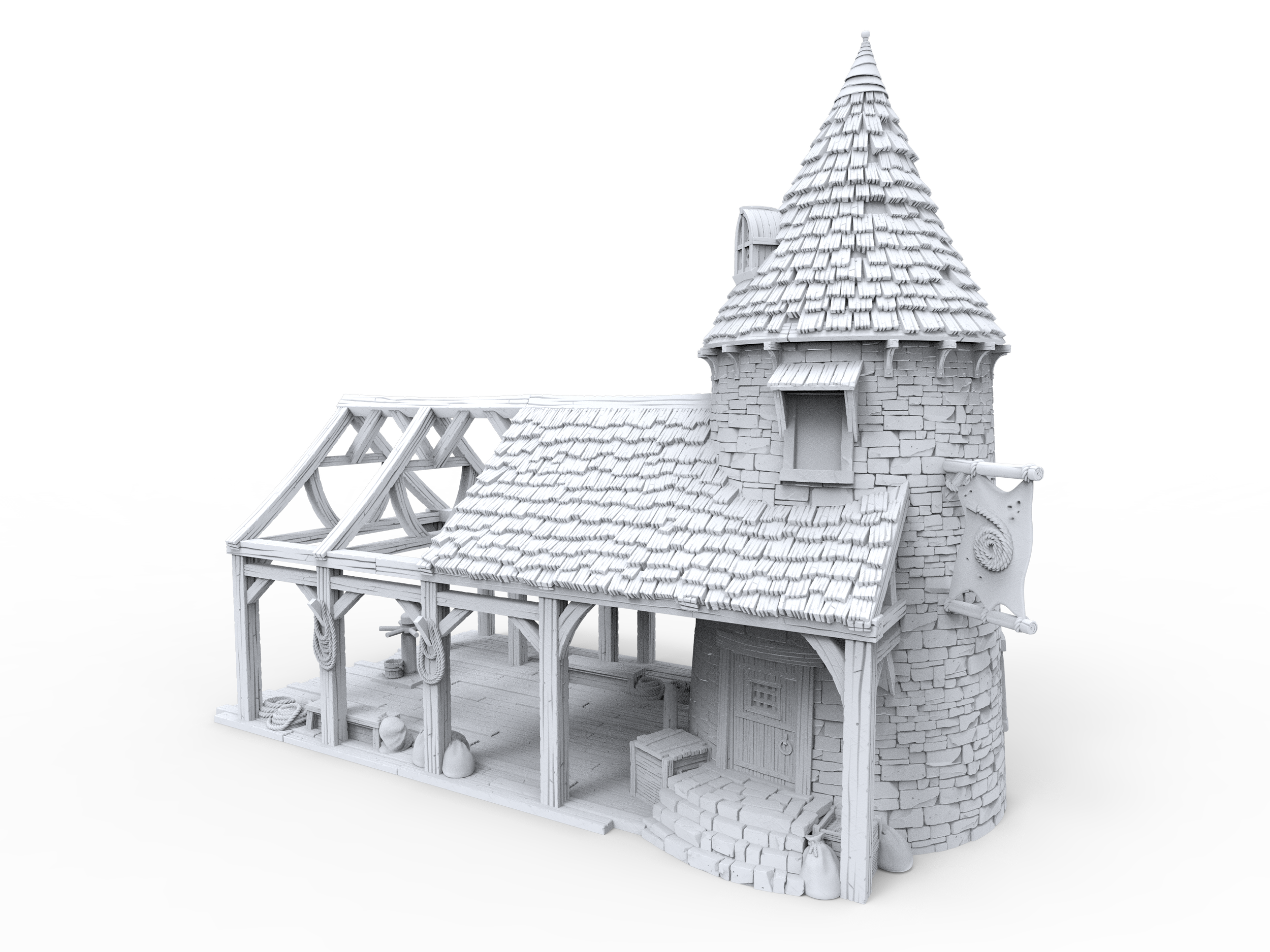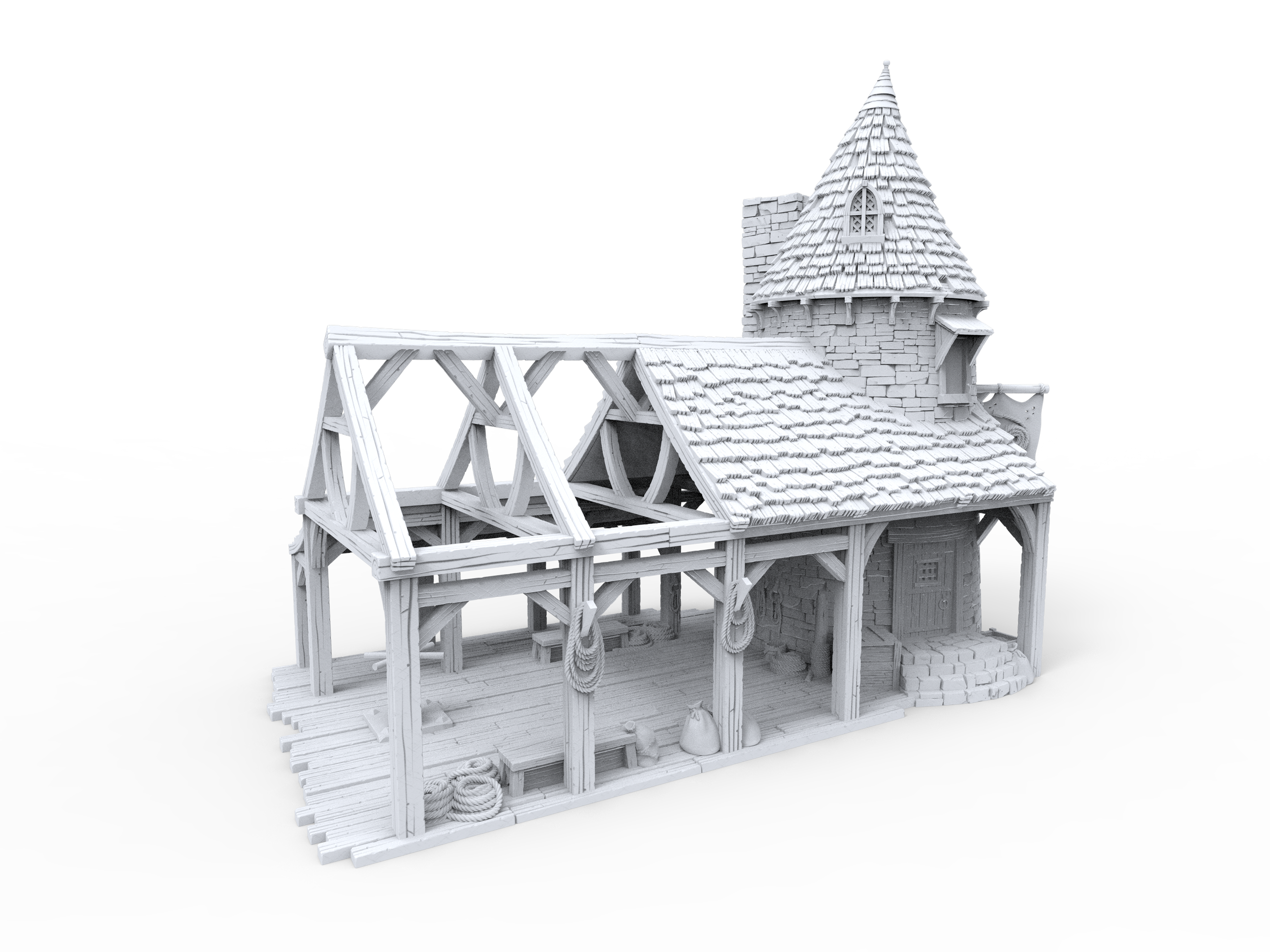 This medieval house has a fully playable interior and working doors. This model is a two story house with a built in staircase.
