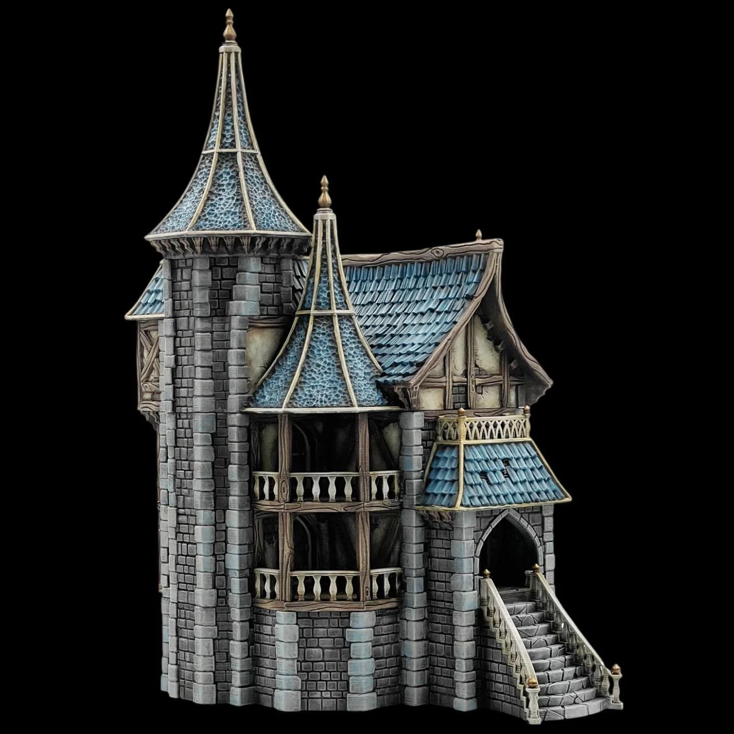 This imposing building has a basement level, a first and second level and two tower levels. All have playable interiors and working doors. The building comes with with a stained glass PDF-printout which I’ll deliver digitally.